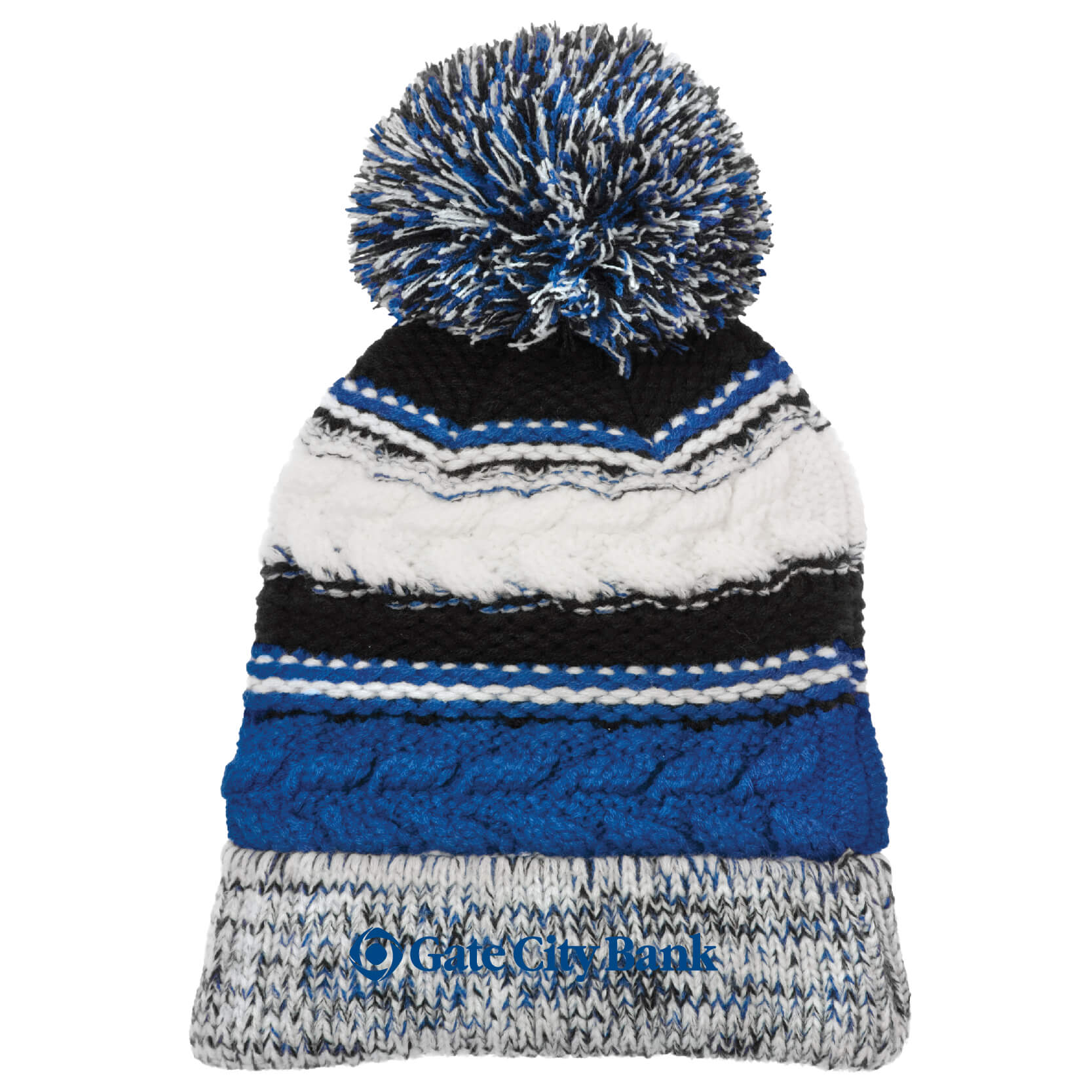 With three team colors and a large pom pom, this chunky-knit beanie will help keep you warm in the stands.