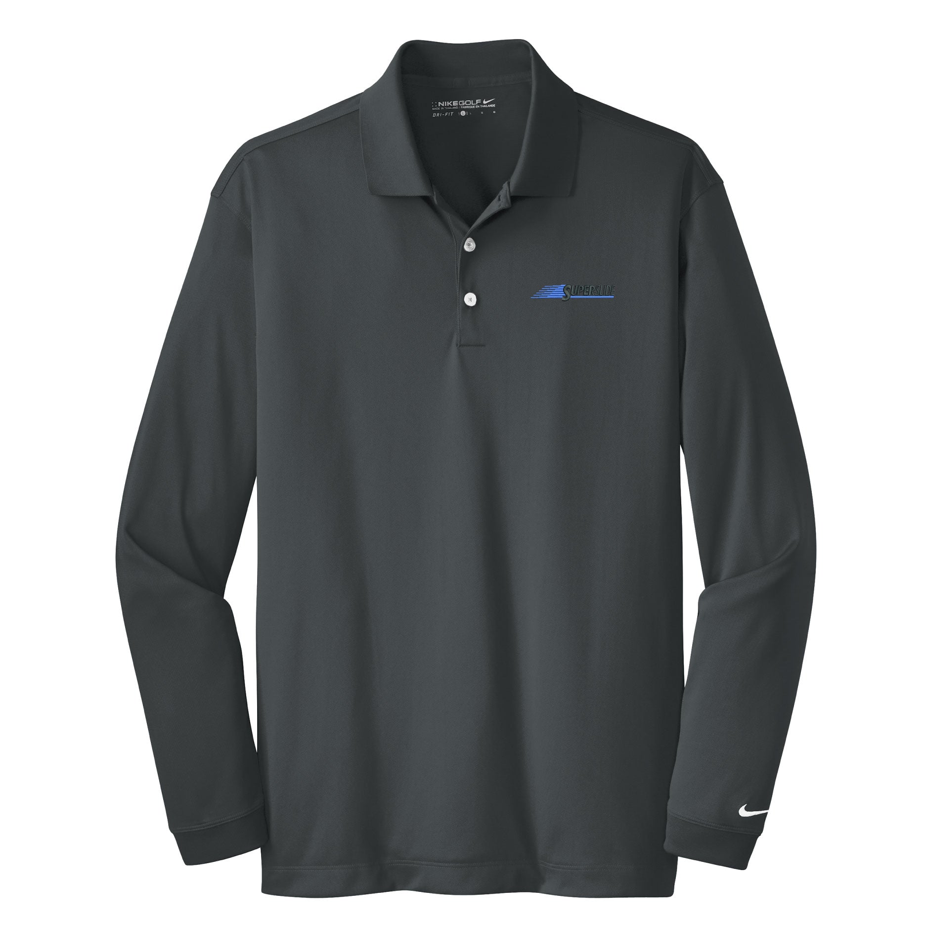 Long sleeves elevate this polo to another level of sophistication while Dri-FIT moisture management technology adds unparalleled performance. Stretch fabric for hassle-free swinging motion. Features a flat knit collar and cuffs and a three-button placket. Heat transfer label for tag-free comfort. Dyed-to-match buttons on Black and Midnight Navy. White buttons on Varsity Red, Anthracite and Blue Sapphire. Side vents. The contrast Swoosh design trademark is embroidered on the lower left sleeve. Made of 5-ounce, 100% polyester Dri-FIT fabric.