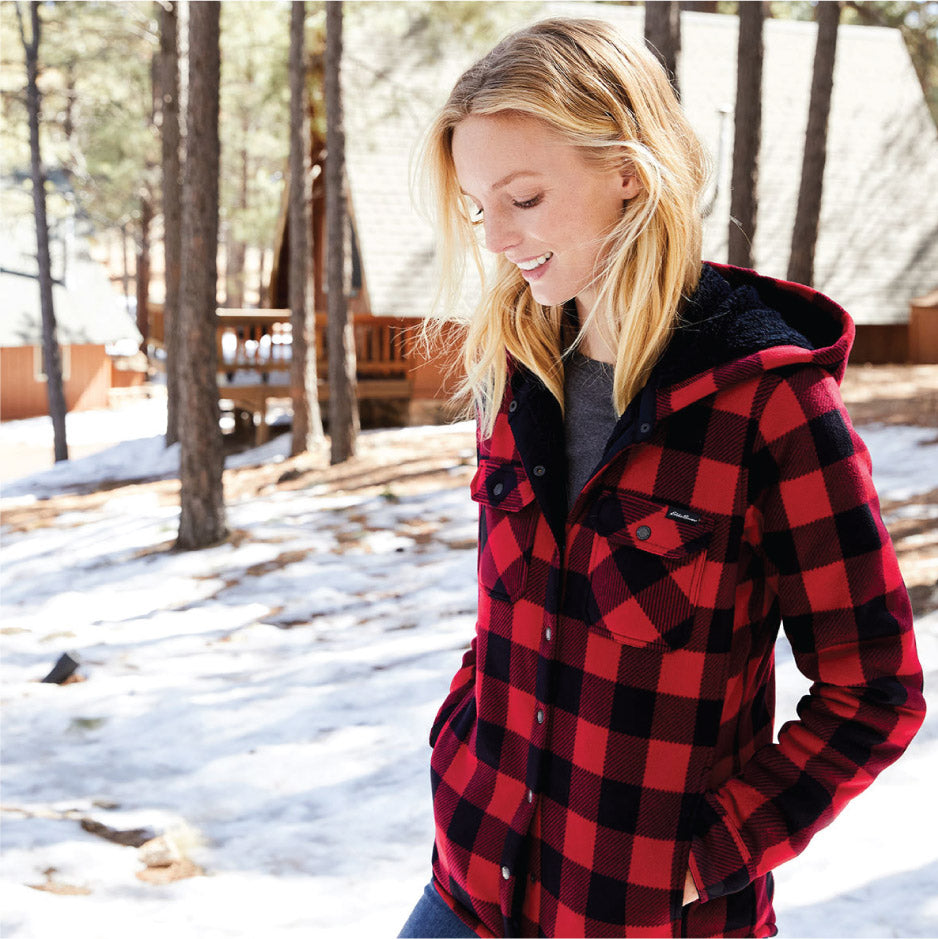 Whether you're spending time inside or outside in cool temps, the high-pile fleece interior of these rugged-looking shirt jacs will keep you warm. Eddie Bauer logo snap-front closure and snap-close chest pockets. Handwarmer pockets. Eddie Bauer woven label at left chest pocket. Two-piece hood. Made of 10.3-ounce, 100% polyester microfleece bonded with 100% polyester high-pile fleece interior. 100% polyester woven details.